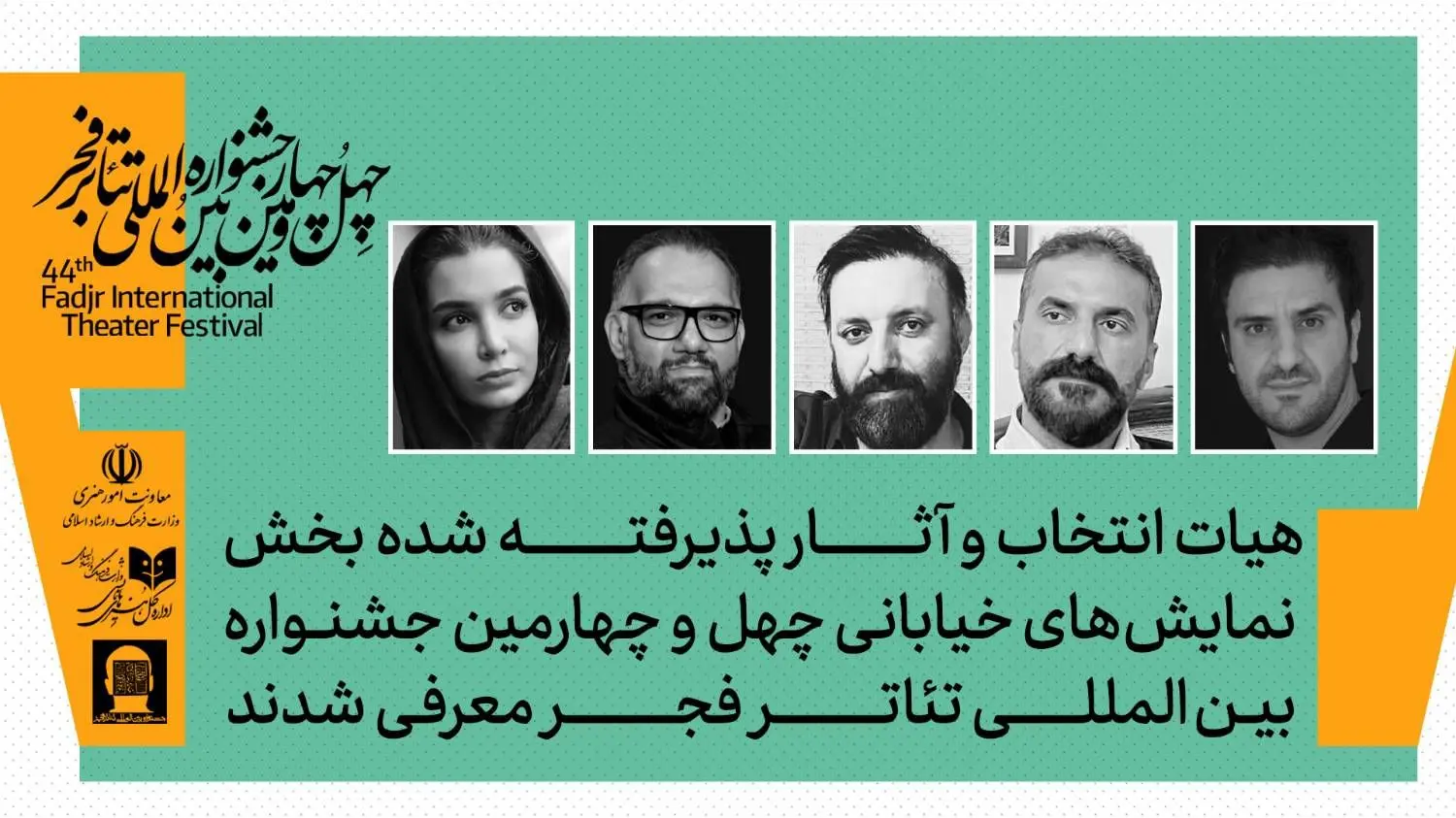 به گزارش هنرآنلاین، از سوی دبیرخانه چهل‌وچهارمین جشنواره بین‌المللی تئاتر فجر هیئت انتخاب بخش نمایش‌های خیابانی این رویداد هنری که مدیریت آن را مریم کاظمی بر عهده دارد؛ اعلام و معرفی شدند.