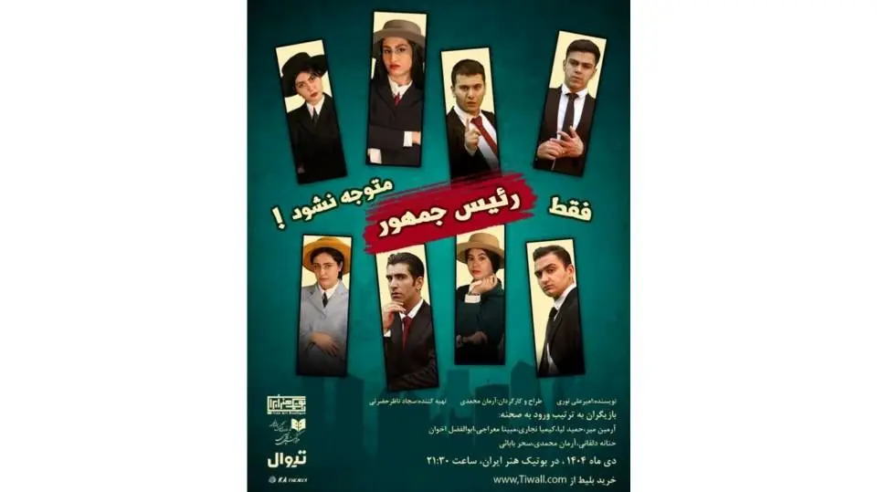 به گزارش هنرآنلاین، نمایش «فقط رئیسجمهور متوجه نشود!» به نویسندگی امیرعلی نوری و طراحی و کارگردانی آرمان محمدی، از ۴ تا ۲۳ دیماه، هر شب ساعت ۲۱:۳۰ در سالن شماره ۶ بوتیک هنر ایران، روی صحنه میرود. بازیگران این نمایش (به ترتیب ورود به صحنه) عبارتند از: آرمین میر، حمید لیا، کیمیا نجاری، مبینا معراجی، ابوالفضل اخوان، حنانه دلفانی، آرمان محمدی و سحر بابایی.