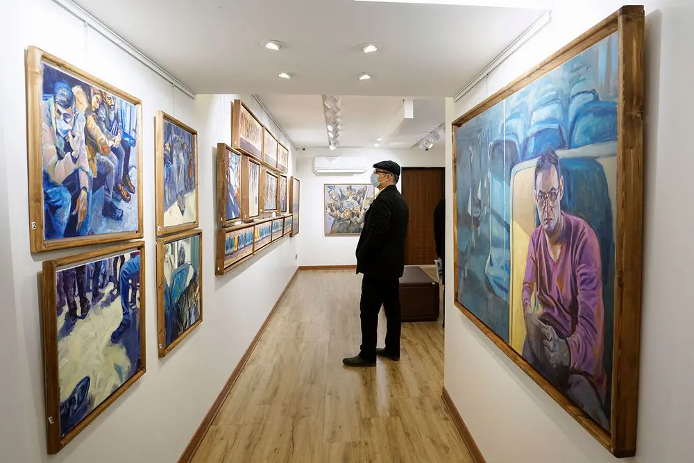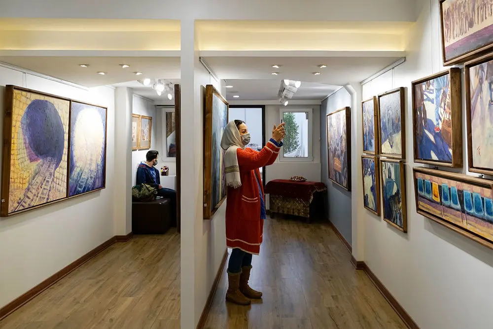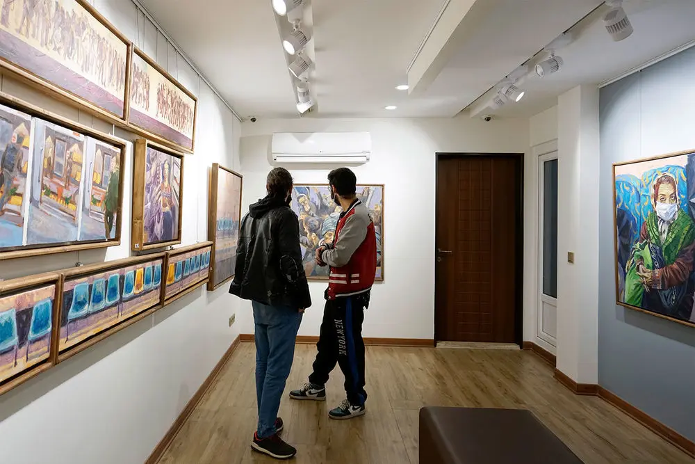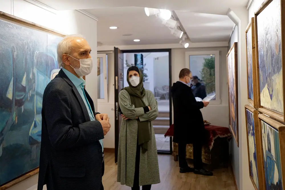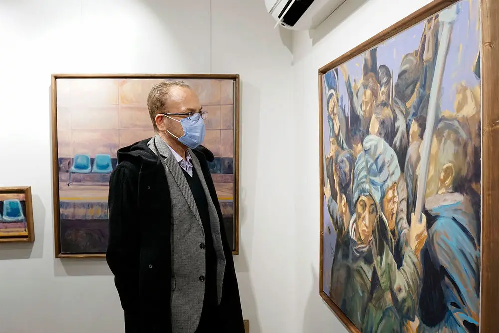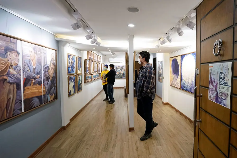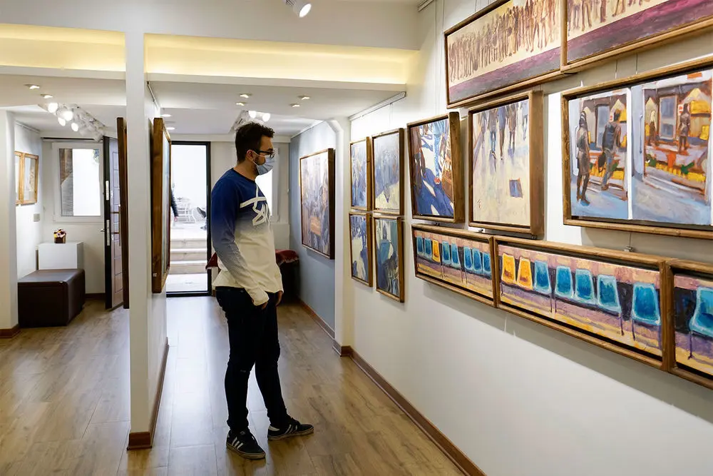 Armin Ebrahimpouris hanging his latest paintings in an exhibition entitled “The Greatest Confusion” at Baharak Gallery. The exhibit will continue until February 3.