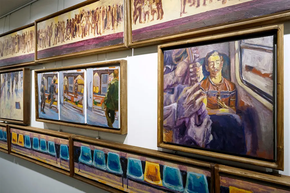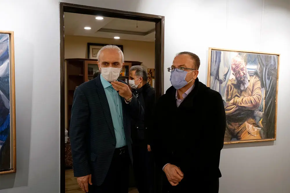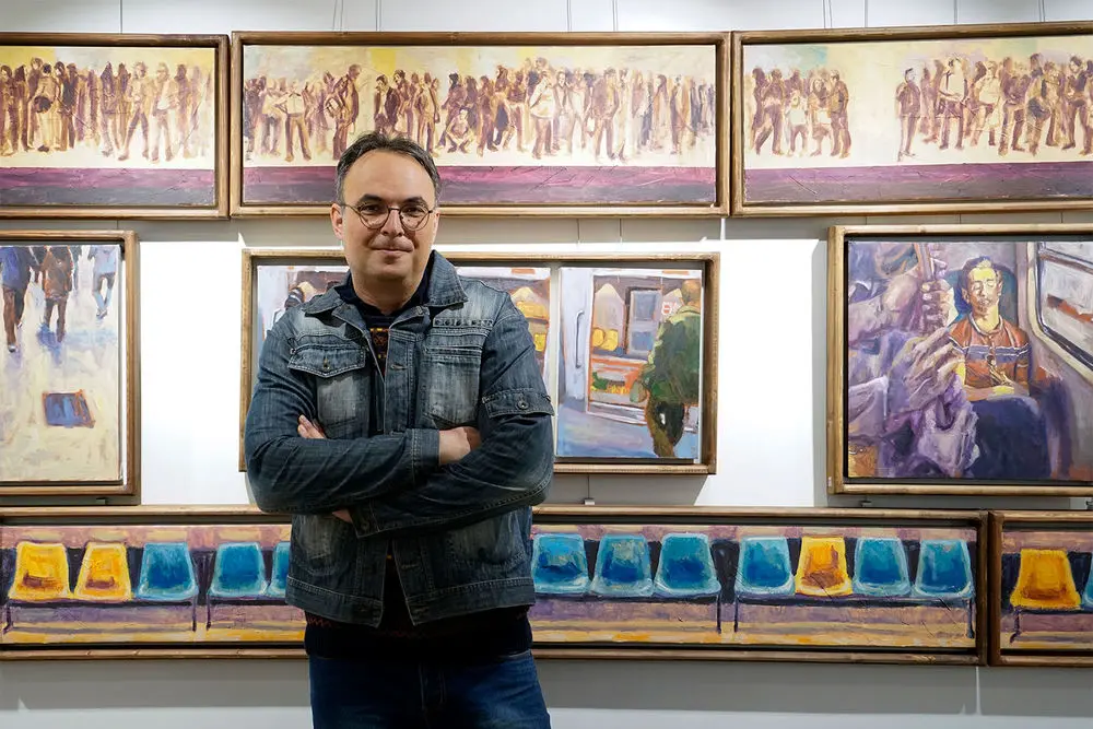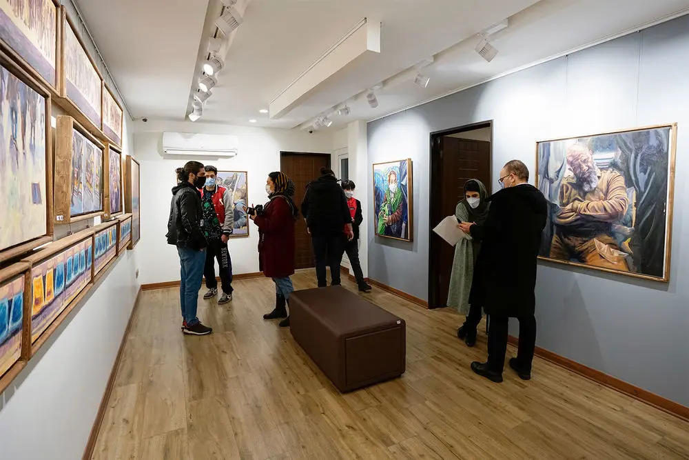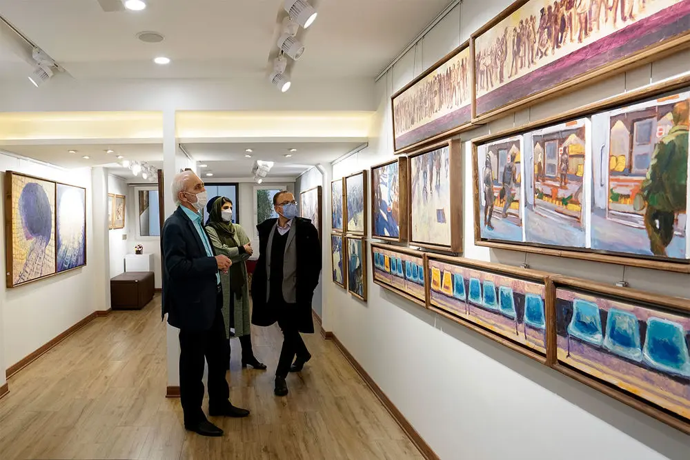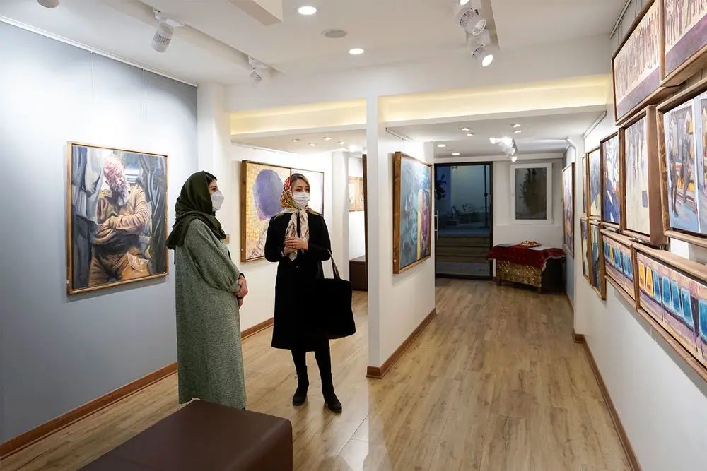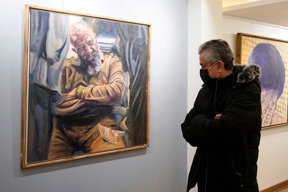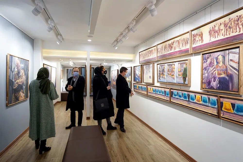 Armin Ebrahimpouris hanging his latest paintings in an exhibition entitled “The Greatest Confusion” at Baharak Gallery. The exhibit will continue until February 3.