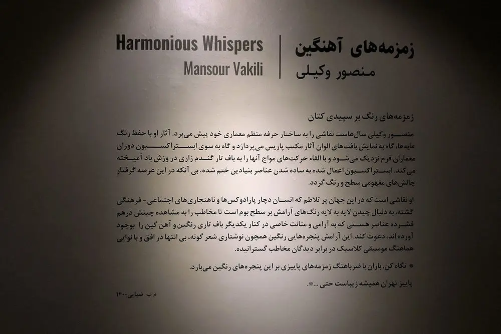 A collection of paintings by Mansour Vakili is on display in an exhibition at Shirin Gallery. Entitled “Harmonious Whispers”, the exhibit will run until November 23.