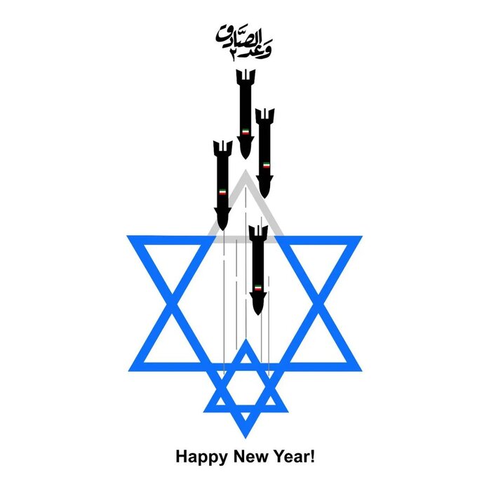 حسین نیرومند هنرمند کاتونیست با انتشار طرحی با عنوان وعده صادق ۲ به انگلیسی نوشت: «!Happy new Year».