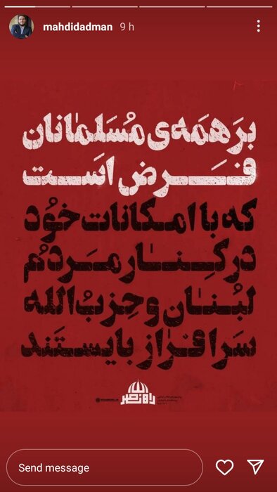 محمد مهدی دادمان رییس حوزه هنری متنی از سخنرانی مقام معظم رهبری را به این عنوان به اشتراک گذاشت: «بر همه مسلمامان جهان فرض است که با امکانات خود در کنار مردم لبنان و حزب الله سرافراز بایستند».