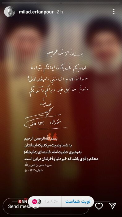 میلاد عرفانپور شاعر ایرانی متنی از وصیت نامه حسن نصرالله شهید مقاومت را به این عنوان به اشتراک گذاشت: به شما وصیت می کنم که ایمانتان به رهبری حضرت امام خامنه ای محکم و قوی باشد که خیر دنیا و آخرتتان در این است.