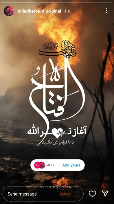میلاد هارونی خواننده و اهنگساز با انتشار تصویری از آتش گرفتن محل اصابت موشک های ایرانی به پایگاه های نظامی رژیم صهیونیستی نوشت: «آغاز نصرالله، دعا فراموش نشود»