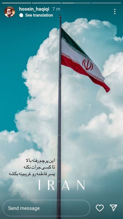 حسین حقیقی خواننده و آهنگسار با انتشار عکسی برافراشته از پرچم ایران نوشت: «این پرچم بالا رفته تا کسی جرات نکنه پسر فاطمه را غریبونه بکشه»